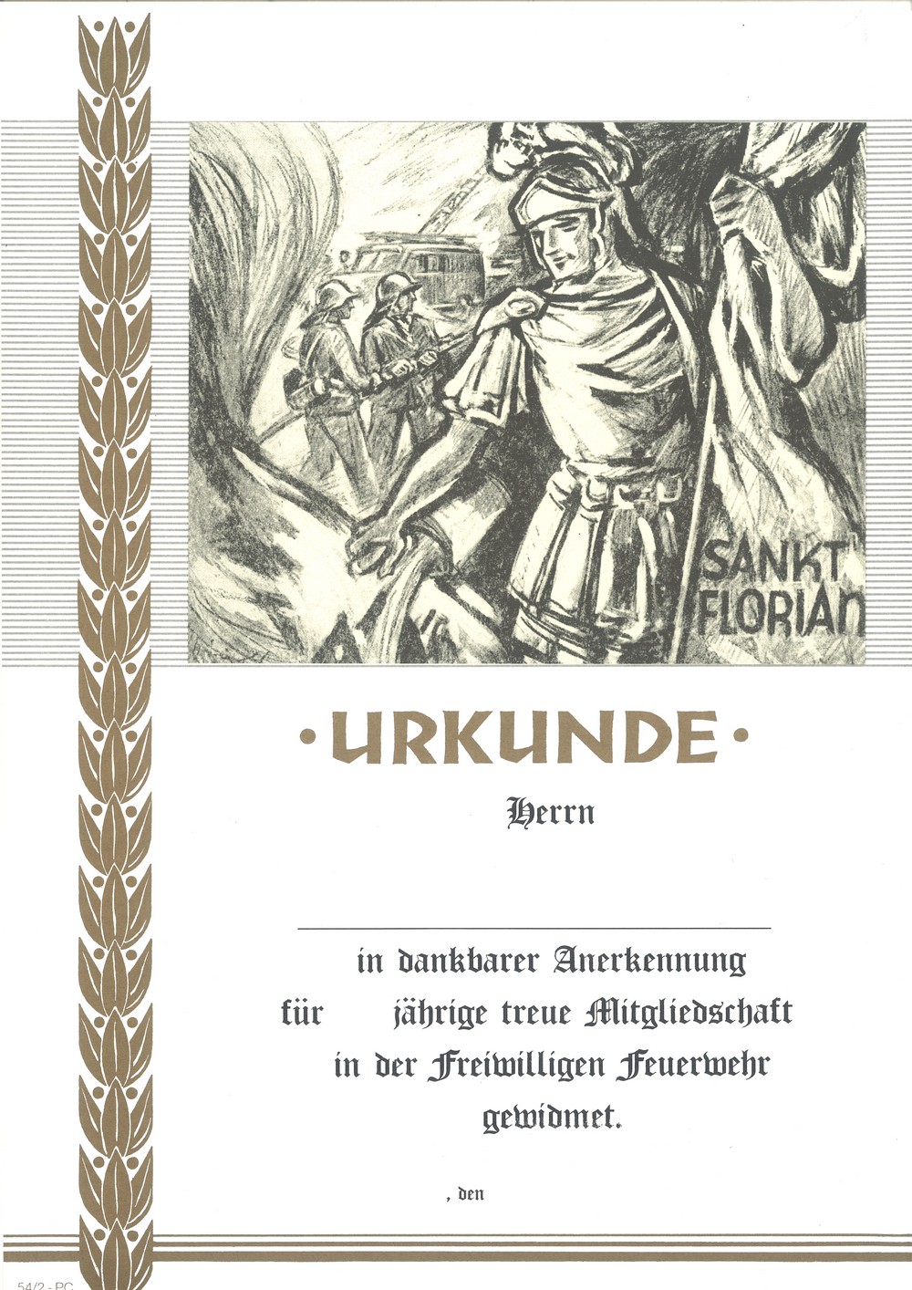 Feuerwehurkunde mit Text in DIN A 4, Bild und Golddruck