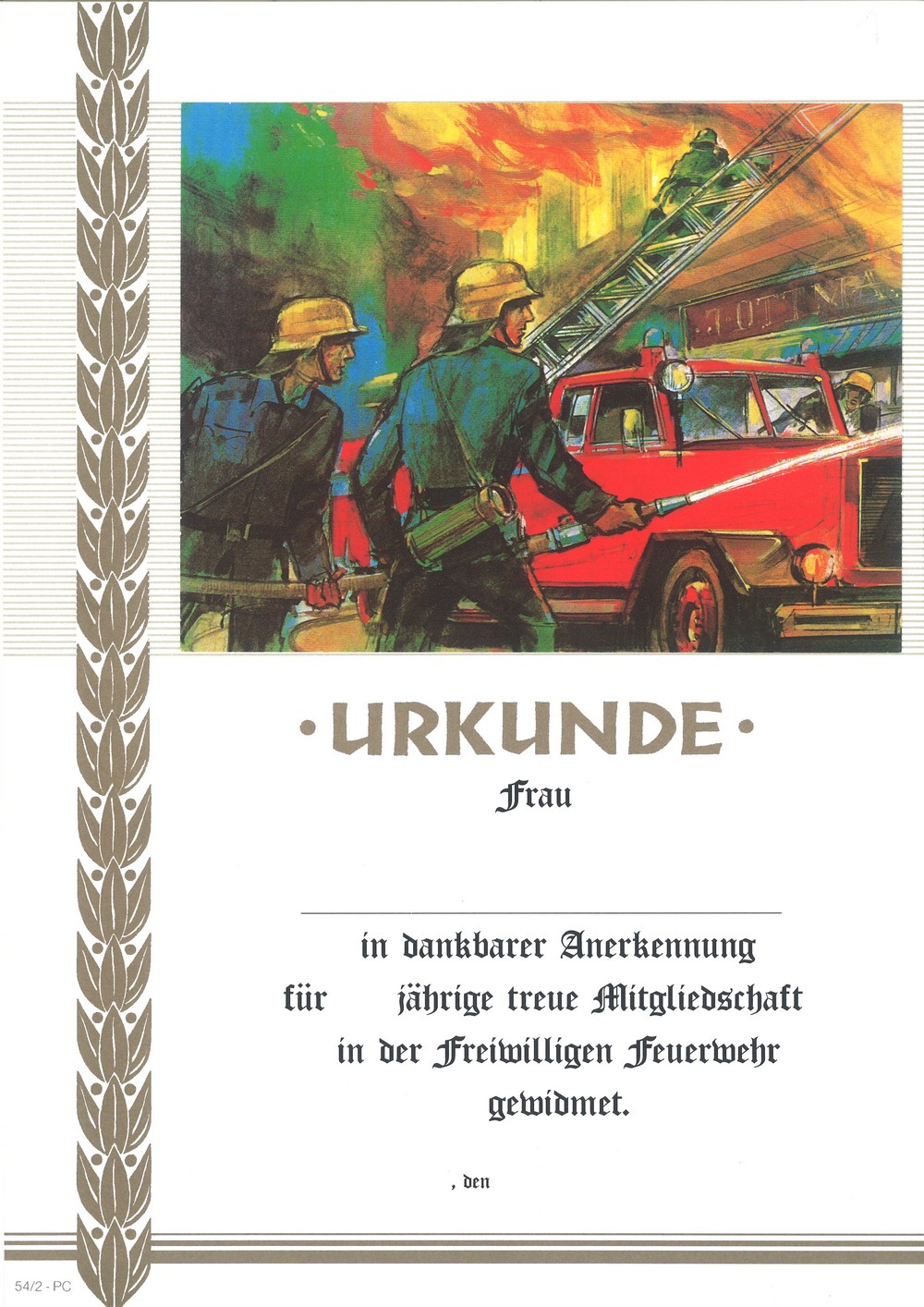 Feuerwehurkunde mit Text für Frauen in DIN A 4, Bild und Golddruck