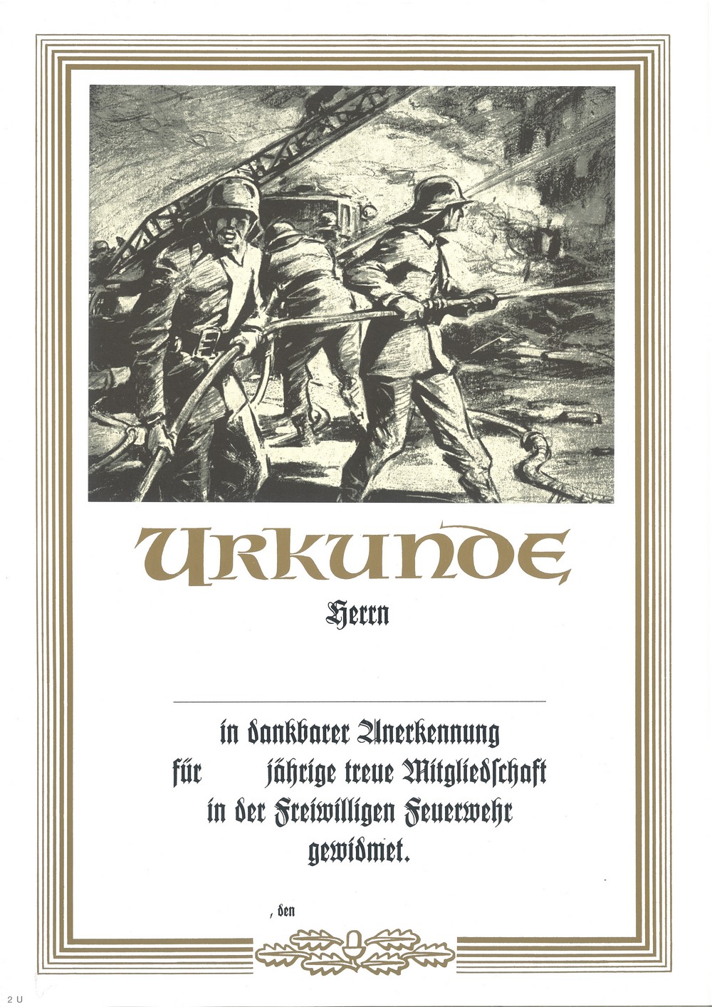 Feuerwehurkunde mit Text in DIN A 4, Bild und Golddruck